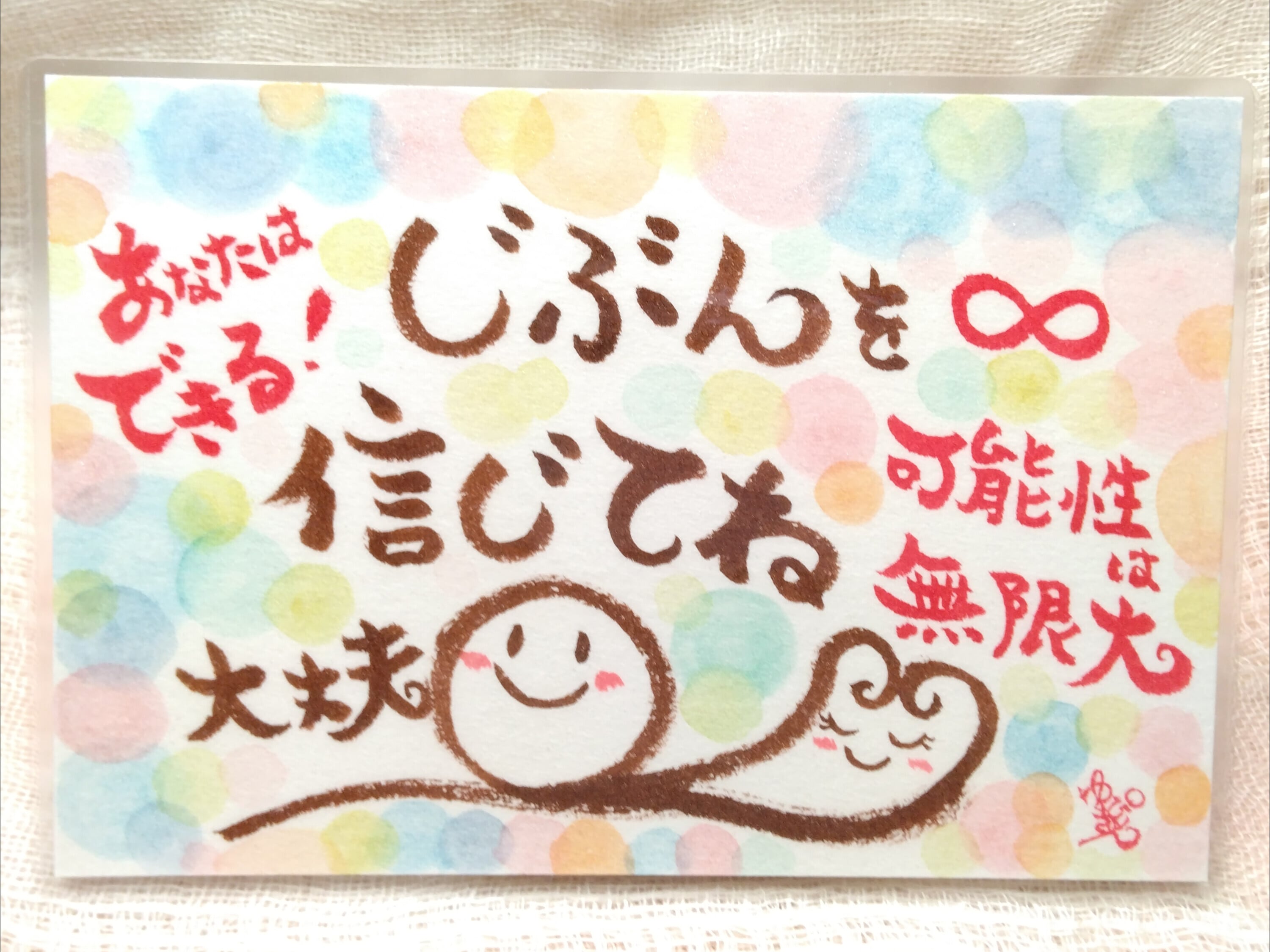 はがきサイズ┃ラミネート加工┃原画・一点もの┃水彩【あなたはできる!∞可能性は無限大 じぶんを信じて。大丈夫。】